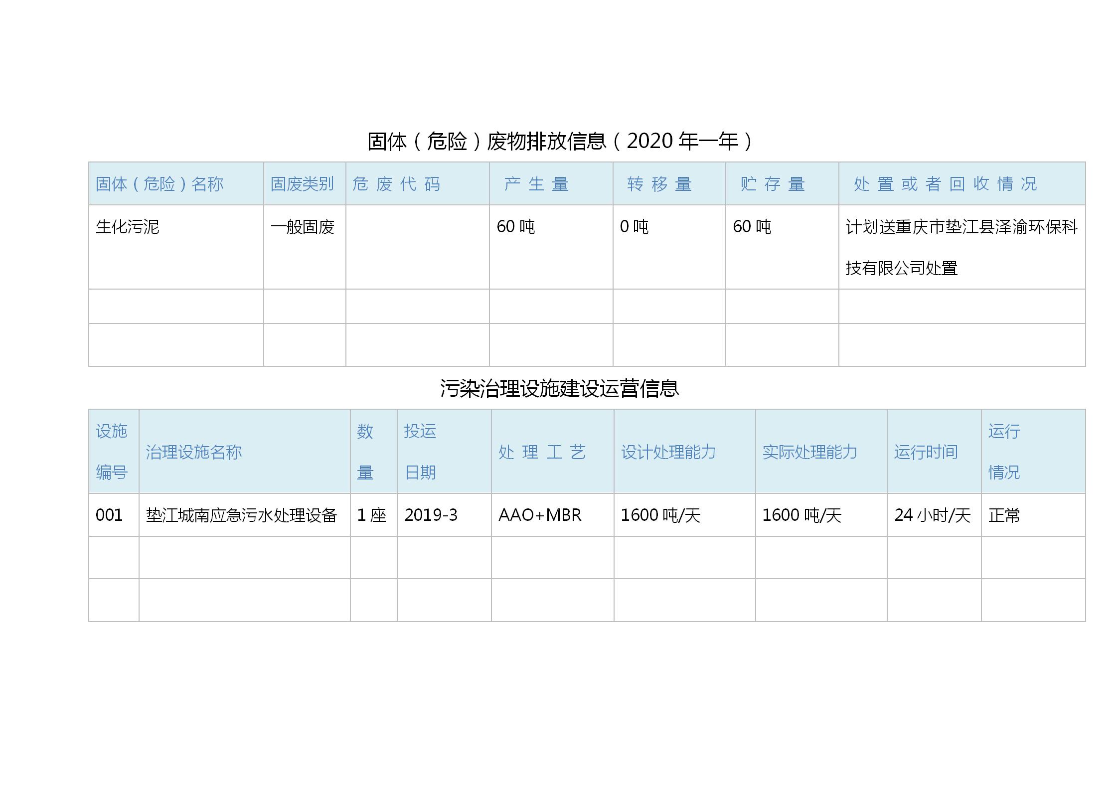 我司運營的墊江縣城南應(yīng)急污水處理設(shè)施,處理規(guī)模:1600方/天,主體工藝采用:MBR一體化設(shè)備,出水排放標(biāo)準(zhǔn):《城鎮(zhèn)污水處理廠污染物排放標(biāo)準(zhǔn)》GB18918-2002)一級B標(biāo),具體內(nèi)容詳見環(huán)境信息公開表。