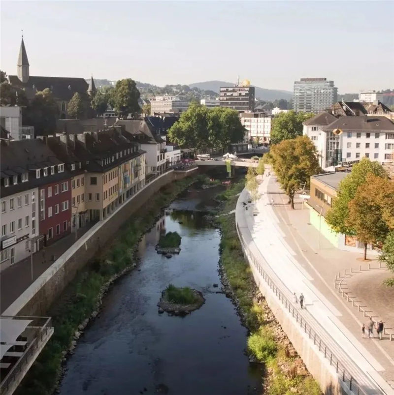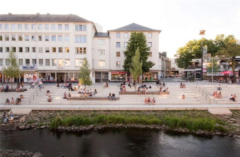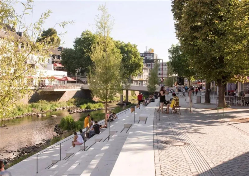 在拆除“ Siegplatte”(位于Sieg河堤防上的停車場)之后,2012年至2016年期間沿著河段的大規(guī)模臺階建設(shè)使得新的直接通往河段的河流成為可能。錫根市中心。希格(Sieg)自然化,擁有草皮的島嶼和岸堤,可以使水生動物和兩棲動物通過生物通道。180米長的樓梯雕塑在河邊,成為城市與河流互動的表演舞臺。鑒于西格(Sieg)的自然風光,西格特雷彭(Siegtreppen)變成了聚會場所。流域變成了上下城鎮(zhèn)之間的墊腳石。該項目獲得了無數(shù)獎項,并獲得了2017年德國景觀建筑獎的“綠色基礎(chǔ)設(shè)施作為戰(zhàn)略”類別。
