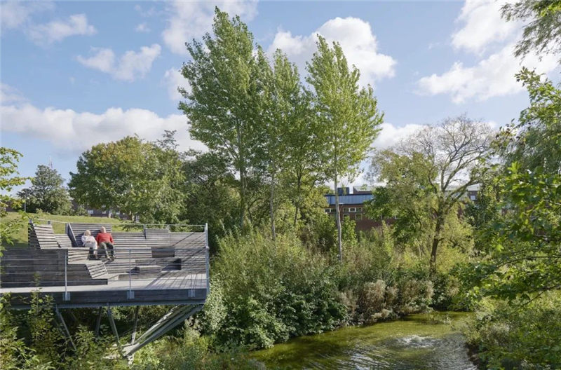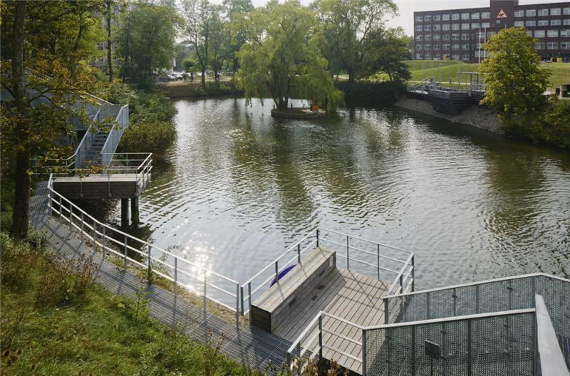 景觀設(shè)計的理念是讓人們以不同的方式去接近池塘陡峭的邊緣,這樣做的目的是在池塘周圍創(chuàng)造具有社會吸引力的場所和散步地。設(shè)計師建立了雙向設(shè)計原則,大池塘的西邊提供了可以駐足、坐下、觀景和約會的地方,這里的陽光甲板和平臺位于水面之上,靠近邊緣。而東區(qū)則恰恰相反,那里有一條蜿蜒的長廊,包含著一些較小的社交空間,沿著落差上下排布的樓梯在局部區(qū)域是一直延伸到水面的。