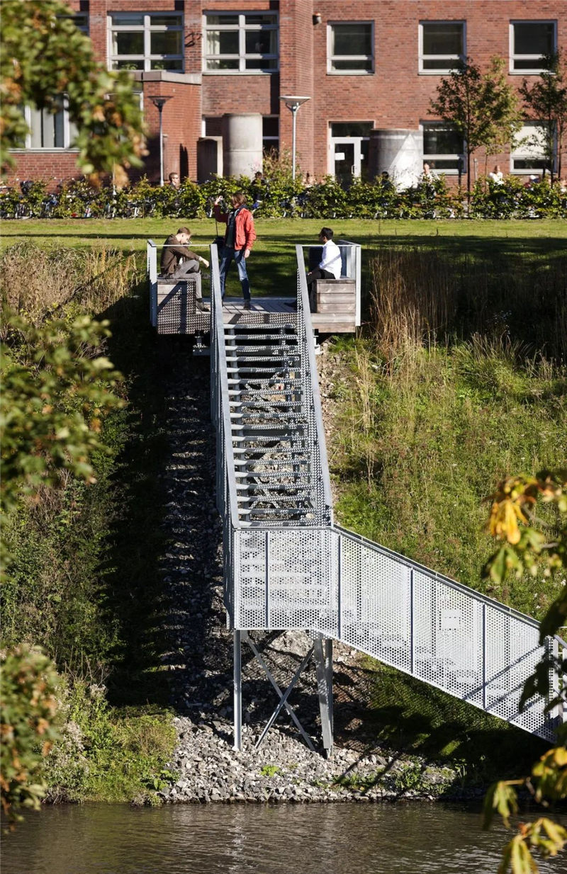 因此,東邊和西邊的設(shè)計和所用的材料也有所不同,西邊的甲板選用的是木板。三個平臺分別被命名為休息室、涼亭和劇場,這也是設(shè)計這三個場地時所依據(jù)的概念。東邊是一個由拉伸鋼板和樓梯組成的裝配平臺,就像你在建筑工地上看到的那種類型,這也反映了學(xué)校的一些授課內(nèi)容。東側(cè)是平緩的,幾乎漂浮在水面上,設(shè)計師在此精心安排了一條有趣的散步長廊;西側(cè)堅固、穩(wěn)定、重力高,形成了休息和社交的場所。