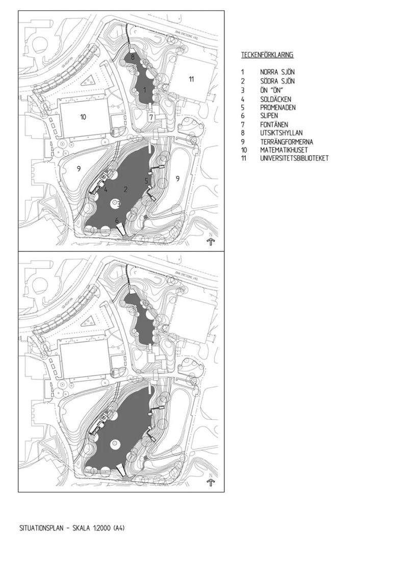 這個校園景觀項目便是針對如何補救上述缺點的一個解決方案,這塊場地相當?shù)碾[蔽,而且風還很大,不過有一個部分是突出的:兩個池塘周圍的區(qū)域。這塊區(qū)域原來是一個舊的粘土采石場,以前用來供應(yīng)制磚原料,粘土坑是地下的深井,如今已充滿了水。與周圍開闊、傾斜的地面相比,這里有著引人注目的背景環(huán)境:在邊緣處有一個急劇的下降,近乎垂直。這里的氣候不同于校園的其他地方,茂盛的植被可以抵御風的吹拂,濱水的特點同時優(yōu)化了場地質(zhì)量,這應(yīng)該是學(xué)校發(fā)展新社交中心的一個良好開端,多年來它一直缺乏這種社交屬性。