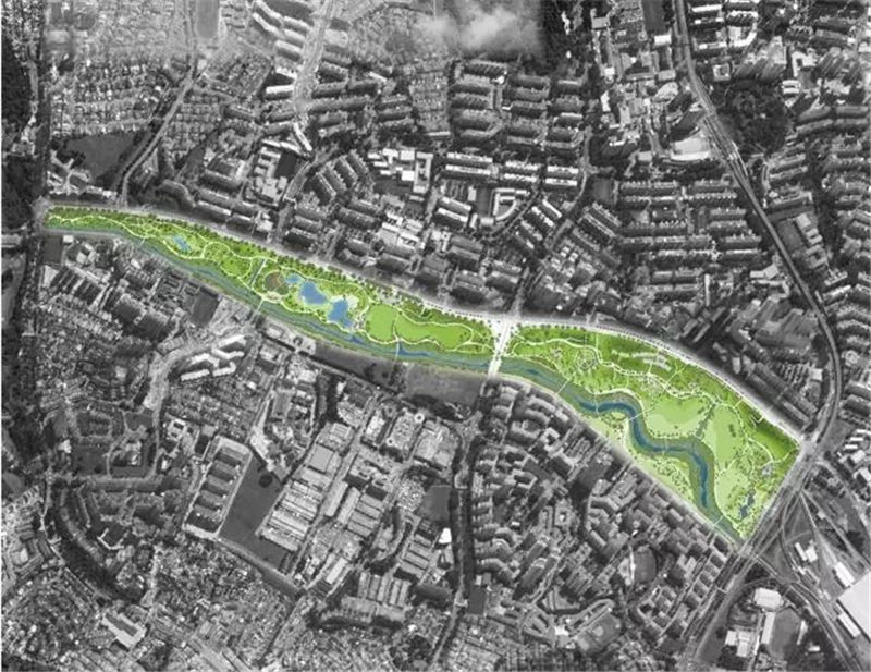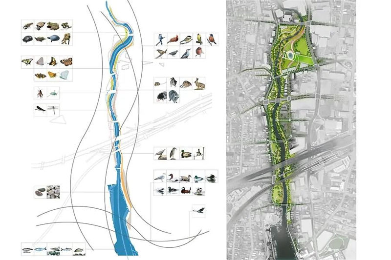 該方案在一個泛濫平原理念的基礎(chǔ)上設(shè)計,當水位低時,人們能夠在寬闊的河岸沿線親近水、享受休閑活動,而在暴雨時期,河流附近的公園綠地成為一條運輸線路,運送下游的水流,在公園內(nèi)進行多種土地利用,為公共活動建造出更多的空間。